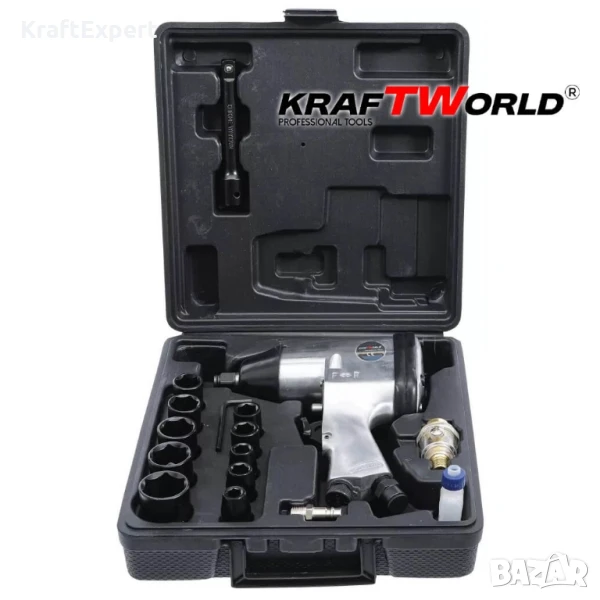 Гайковерт 1/2” комплект 17 части в куфар KraftWorldПневматичният гайковерт KraftWorld 1/2” е издръжлив и мощен инструмент, подходящ за автосервизи и индустриални приложения. С максимален въртящ момент от 850 Nm и свободна скорост от 6700 rpm, той осигурява бърза и ефективна работа. Комплектът включва 17 части, сред които 10 шестограма, удължител, масло за инструменти и практичен пластмасов куфар за удобно съхранение и транспорт.✅ Идеален за ремонтни дейности и професионална употреба✅ Компактен и удобен дизайн за лесно боравене✅ Средна консумация на въздух: 5cfmСъдържание:1x пневматичен винтоверт 1/210x шестограм 1/2 цола 9, 10, 11, 13, 14, 17, 19, 22, 24, 27 милиметър1x удължител1x Mini мазач1x 4 mm шестограмен ключ1x цев1x инструмент масло1x куфарХарактеристики:Пневматичен ударен гайковерт .Квадратна предавка: 1/2?Максимален въртящ момент: 850 NmСвободна скорост: 6700 rpmСредна консумация на въздух: 5cfm