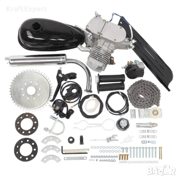 Превърнете велосипеда си в мощна машина с двигателя KraftWorld – качество, надеждност и удобство в един комплект!Открийте нов начин да се придвижвате бързо, икономично и с удоволствие! Двигателят KraftWorld е създаден специално за монтаж на велосипеди, предоставяйки ви възможността да превърнете любимото си колело в моторизиран велосипед. Идеално решение за ежедневни пътувания, хобита или приключенски разходки, този двигател е перфектната комбинация от иновация и функционалност.Защо да изберете двигателя KraftWorld?Комплект, готов за монтаж: Всички необходими части и елементи са включени – няма нужда от допълнителни покупки или сложни настройки. Просто сглобете и тръгнете!Висока мощност: С 3.5KW и до 6000 об./мин., този двутактов двигател осигурява забележителна производителност.Икономичност: С разход от само 2.5 литра на 100 километра, той е икономичен и щадящ бюджета ви.Впечатляваща скорост: Развивайте до 50 км/ч и се наслаждавайте на динамичното каране.Лесен монтаж: Подходящ за различни видове велосипеди, двигателят се инсталира бързо и удобно, без нужда от професионална помощ.Технически характеристики:Работен обем: 80 см³Максимална мощност: 3.5KW (6000 об./мин.)Тип двигател: ДвутактовМаксимална скорост: 50 км/чРазход на гориво: 2.5 л/100 кмПодобрете всекидневието си:С двигателя KraftWorld вашият велосипед ще се превърне в удобно, практично и вълнуващо средство за транспорт. Спестете време, усилия и гориво, като същевременно добавите доза забавление към всяко пътуване.