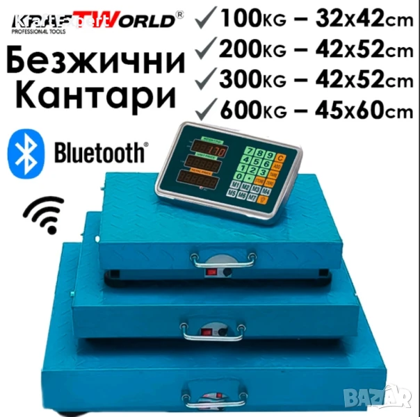 Кантарите KraftWorld – Прецизност и Надеждност за Вашия БизнесНашите електронни безжични платформени кантари KraftWorld са създадени за професионална употреба в магазини, складове, пазари, производствени бази и други търговски обекти. Благодарение на здравата конструкция, широкия диапазон от товароносимост и модерните функции, те осигуряват надеждно и бързо претегляне всеки път.Основни характеристики:✅ Безжична работа и Bluetooth свързаност – позволява гъвкаво позициониране без нужда от кабели✅ Голям електронен дисплей с подсветка – осигурява отлична видимост при всякакви условия✅ Функция за ценообразуване – автоматично изчислява стойността на претеглените стоки✅ Функции за нулиране и тариране – за точно и удобно измерване✅ Бърз и точен процесор – гарантира моментална реакция и висока точност✅ Издръжлива батерия – подходяща за мобилна работа и натоварена ежедневна употреба✅ 36 месеца гаранция – спокойствие и сигурност при всяка покупкаМодели и размери:✔️ 100 кг – 120 лв / Платформа 32×42 см✔️ 200 кг – 139 лв / Платформа 42×52 см✔️ 300 кг – 165 лв / Платформа 42×52 см✔️ 600 кг – 240 лв / Платформа 45×60 смНезависимо дали работите с малки пакети или тежки товари, ще намерите точния модел според нуждите на вашия бизнес. Не правете компромис с точността – изберете KraftWorld за дълготрайна, ефективна и прецизна работа!