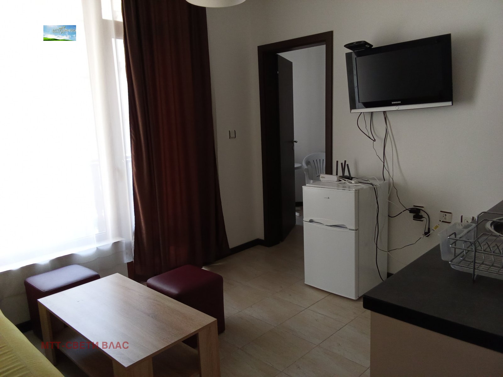 Предлагаме за продажба двустаен апартамент за целогодишно ползване или отдаване под наем в град Свети Влас. Апартамента е напълно обзаведен. Намира се на втори етаж и е с обща площ от 45.05 кв.м. Разполага с входно антре, всекидневна с кухненски бокс, баня с тоалетна и тераса, южно изложение. Обзавеждането включва разтегателен диван, легло, гардероб, маса, кухня с всички уреди като фурна, котлони, хладилник и аспиратор. Сградата е предвидена за целогодишно ползване, асансьорът работи и зимата. Комплексът е с АКТ 16 и разполага с басейн и зона за шезлонги и чадъри. В сградата има аптека, магазин, бар. В близост има целогодишен супермаркет, пекарна, автобусна спирка. Разстоянието до плажа е около 200 м.