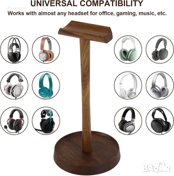 Дървена стойка за слушалки, подвижна стойка за слушалки от орехово дърво с тава за съхранение