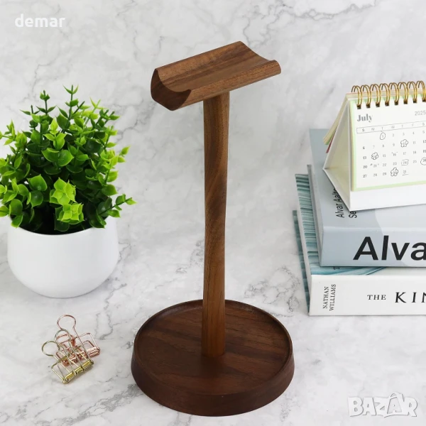 Изработена от масивен орех с естествено покритие, тази стойка за слушалки в скандинавски стил се отличава с двоен дъгов дизайн, който предпазва лентите за глава и подчертава дървесните шарки. Разглобяемата ѝ структура позволява компактно съхранение, а претеглената основа с вградена тава предлага стабилност и място за организиране на аксесоари като слушалки, ключове или USB устройства. Проектирана да е подходяща за всички видове слушалки тип „over-ear“, тя съчетава функционалност и естетика – идеална за изчистени, модерни бюра. Изработена от устойчиви материали и традиционни сглобки, тя предлага издръжливост без лепила.