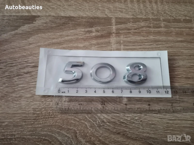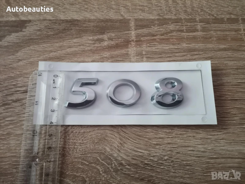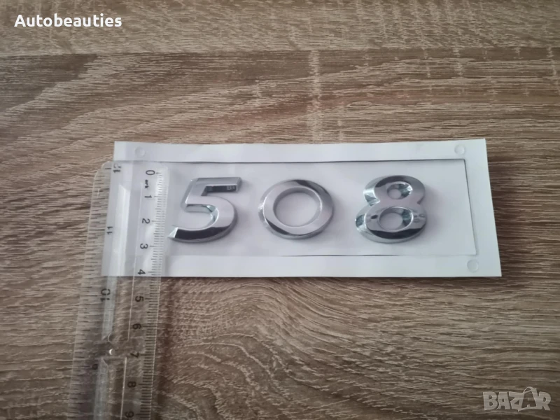 Сребрист надпис за модела 508 на Пежо в стария фонт. Размерите са дадени на снимките.
