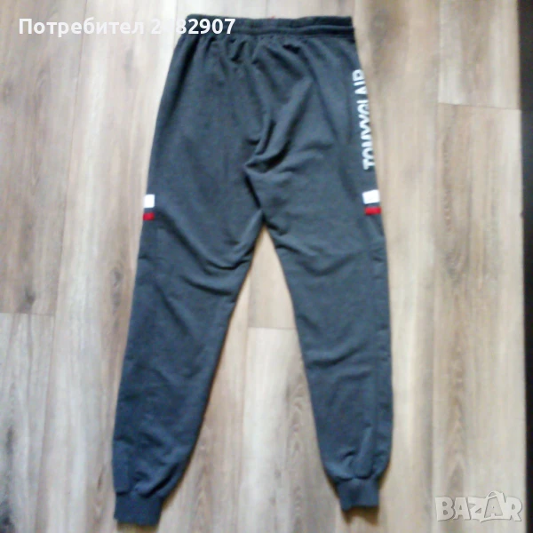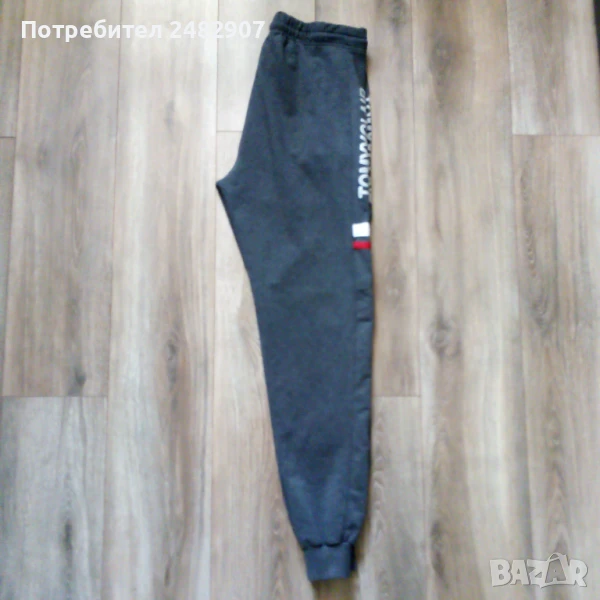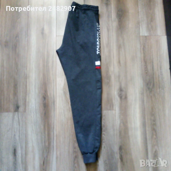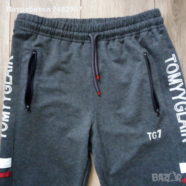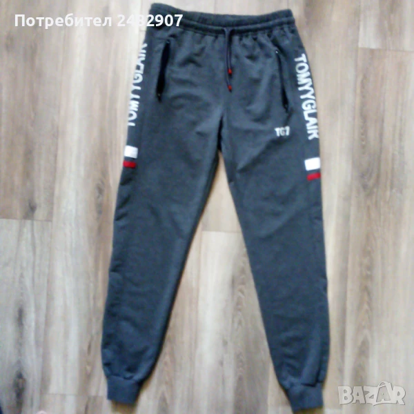 Тъмно сиво мъжко долнище, размер L. Съдържа 100 % памук. Ширина в талията - 38 см, дължина от талията до чатала - 30 см, дължина от талията до долу - 105 см, ширина на крачола в долната част - 10 см. Чисто ново, не е използвано, с ластик в талията, връзки и два джоба с ципове.