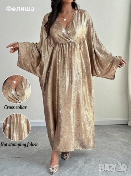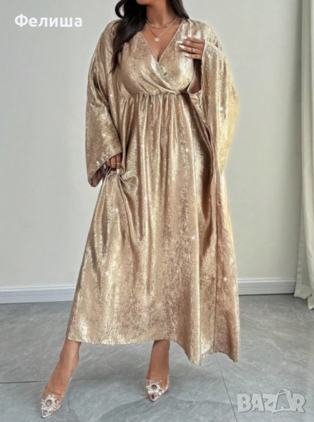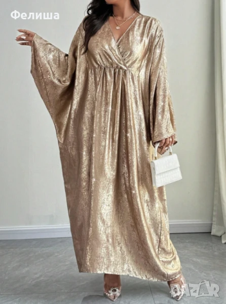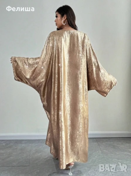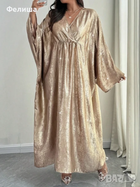 Потопете се в лукса на арабската елегантност с тази дълга, изключително нежна рокля, изработена от фина материя с блестяща нишка, напомняща на течно злато. Тя прелива и играе с цветовете си, създавайки магическо огледално отражение, което пленява с всяко движение.