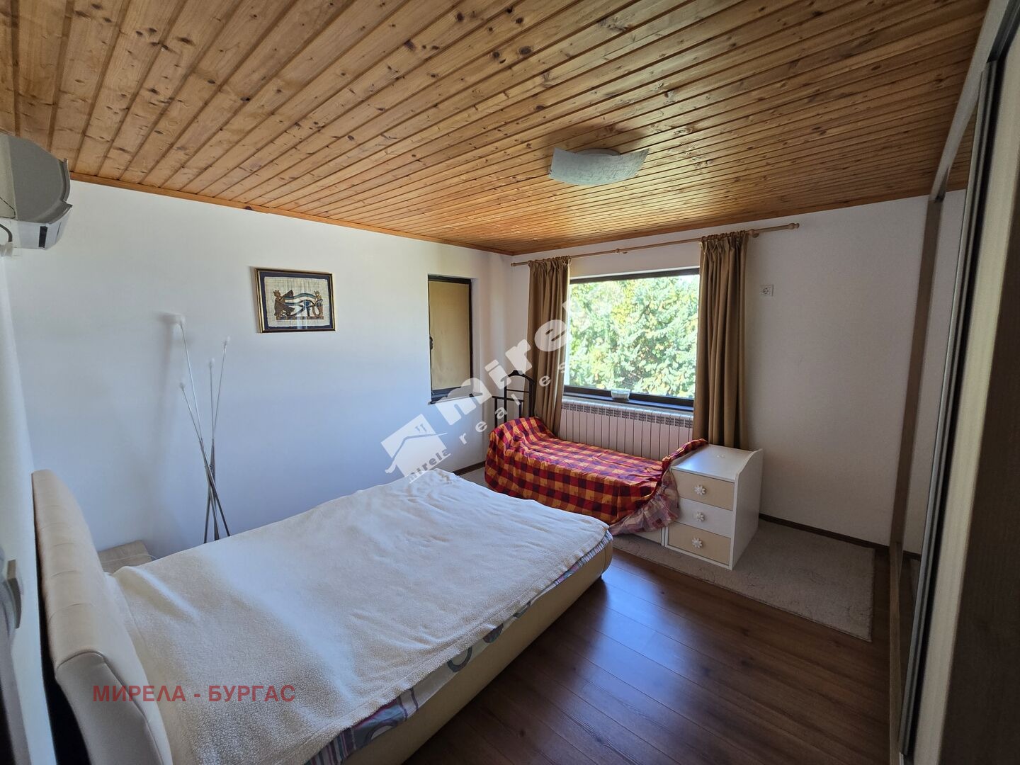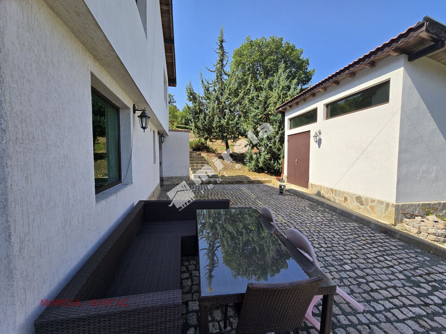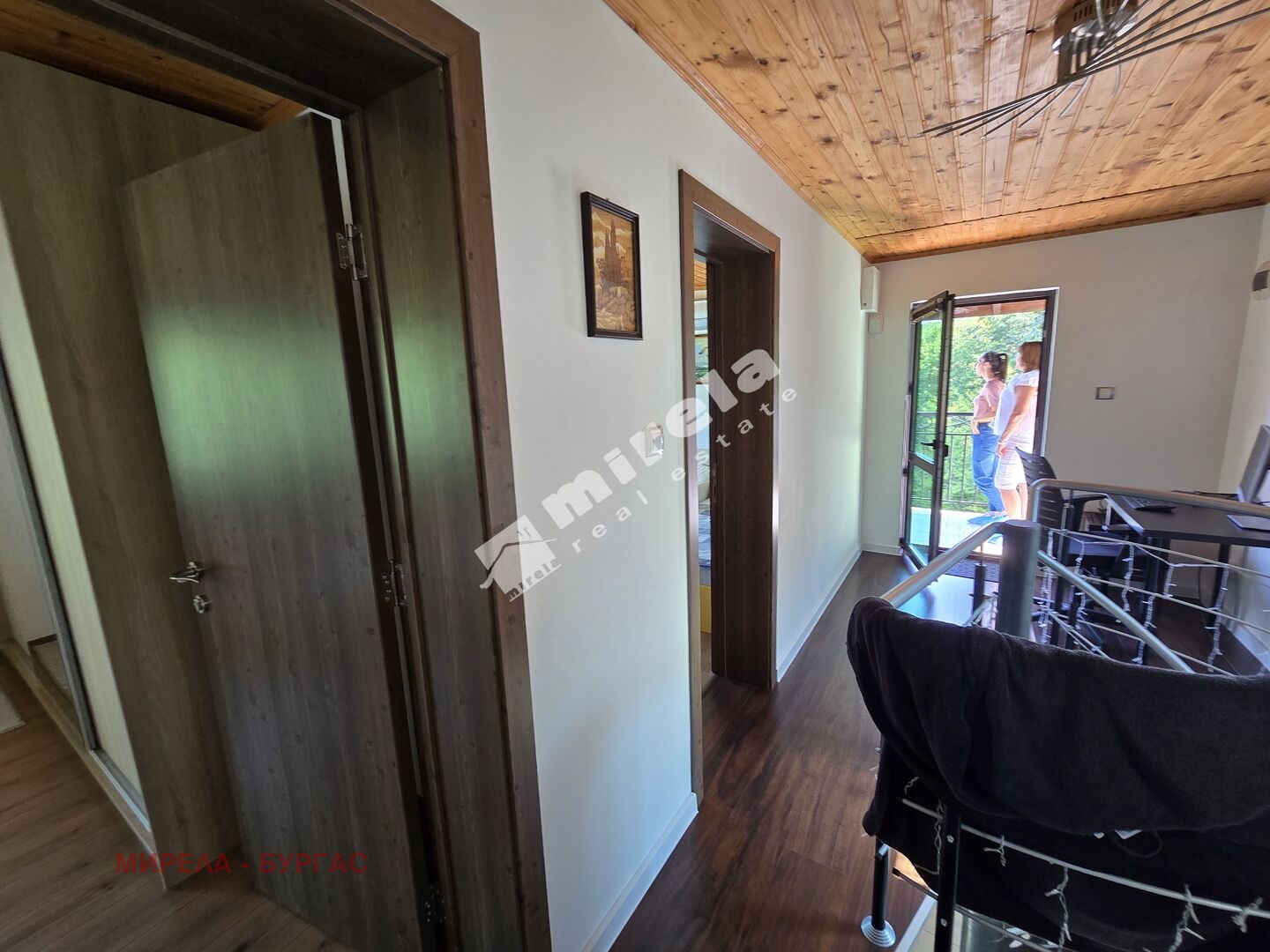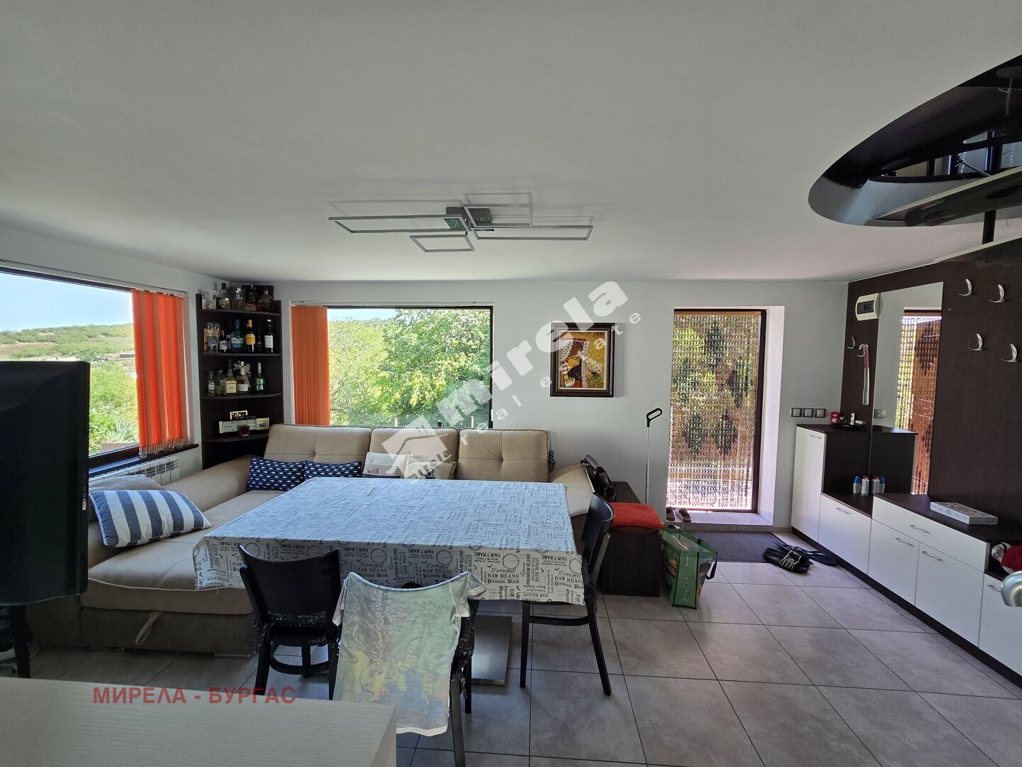 334478 Предлагам за продажба напълно обзаведена къща в село близо до града, само на 15 минути от Бургас, на 10 минути от Созопол и 5 минути от морето. Разположена в живописен район с много зеленина, в близост до гора и с прекрасна панорамна гледка към бургаския залив - нос Атия и залива Вромос. Подходяща за целогодишно обитаване като постоянен дом или за вила. Имотът се състои от къща с РЗП 100кв.м. и находяща се непосредствено до нея допълнителна масивна постройка/трапезария с РЗП 15кв.м. Облагороден двор от 600кв.м с възможност за увеличаване с допълнителни 500кв.м. срещу символична сума. Разполага с централно водоснабдяване и електричество. В допълнение за напоителни нужди е осигурена вода от подземен водоизточник с неограничен дебит. Разпределение: Първи етаж състоящ се от просторна всекидневна с обособен кухненски бокс и санитарен възел - баня с тоалетна. Мазе с приблизителна квадратура 16кв.м. Дизайнерска вита стълба от масивно желязо водеща към втори етаж, състоящ се от: коридор с излаз към голям балкон с изглед към морето, две спални, много голяма баня с тоалетна и вана.