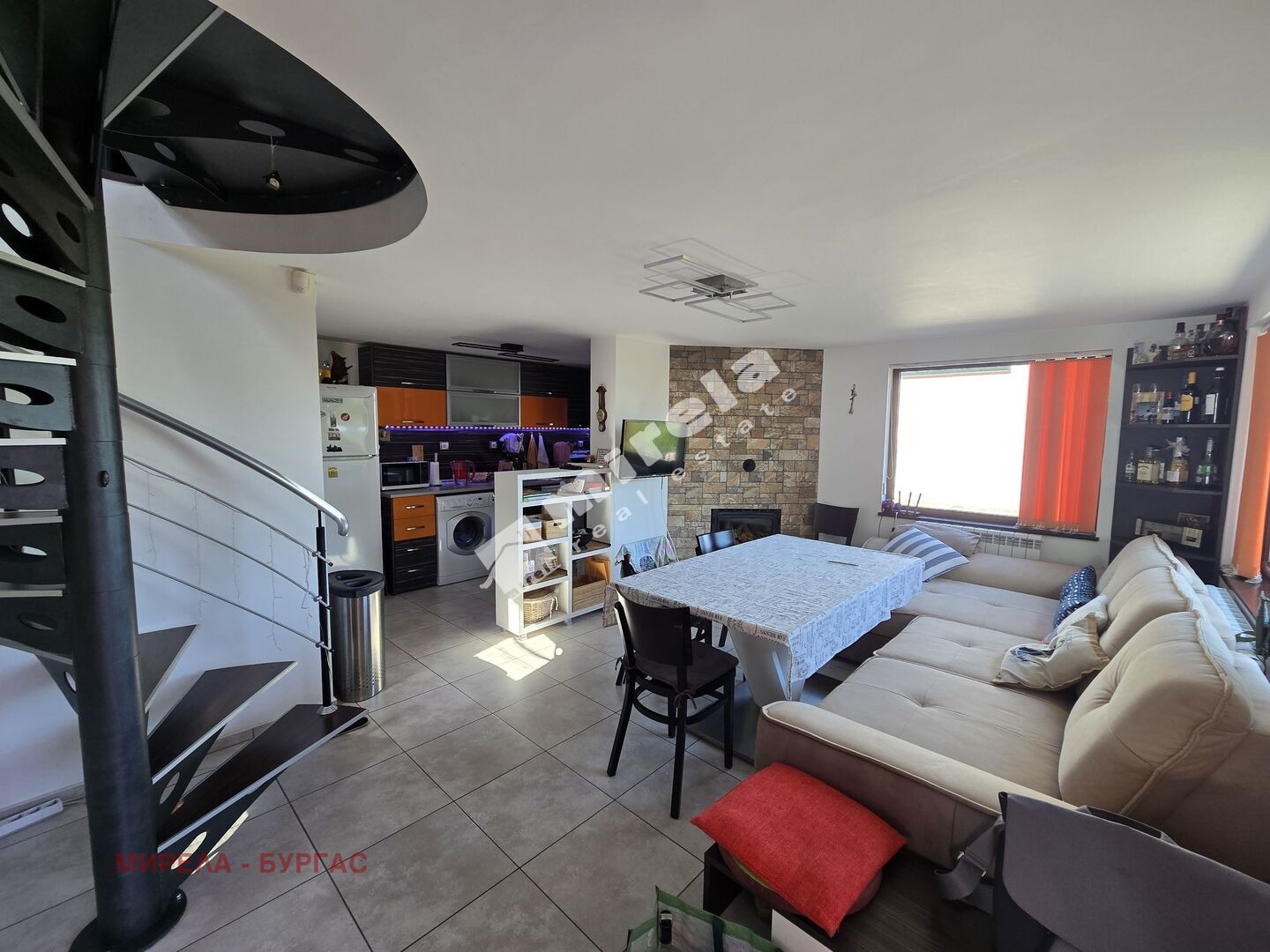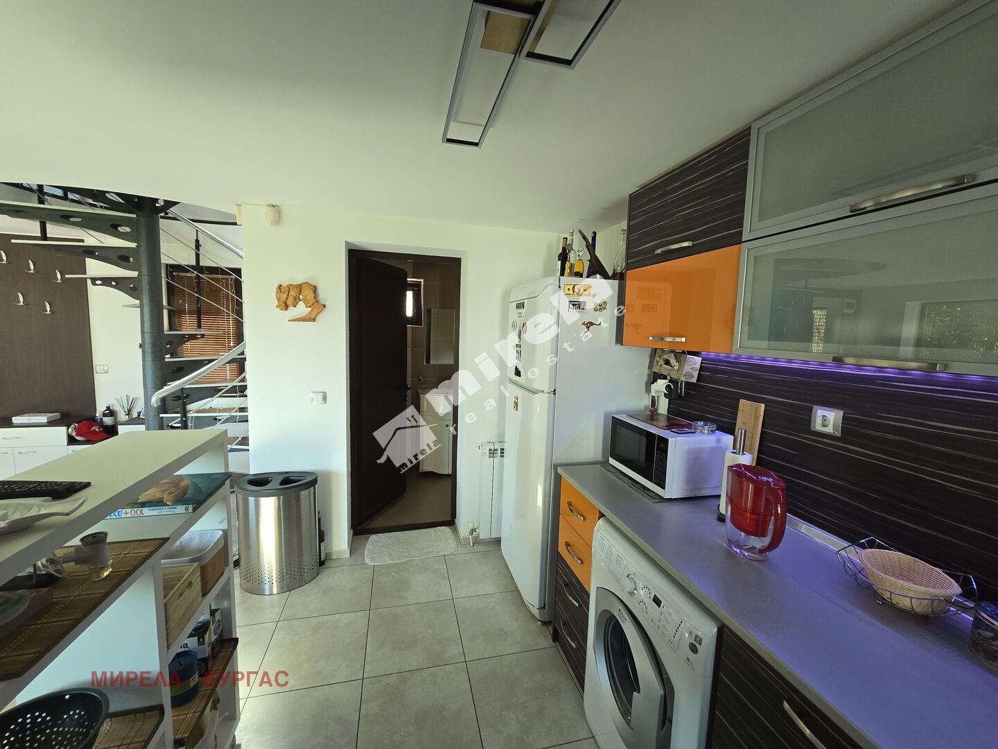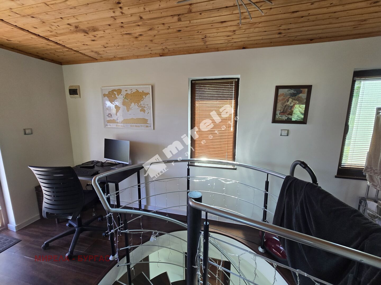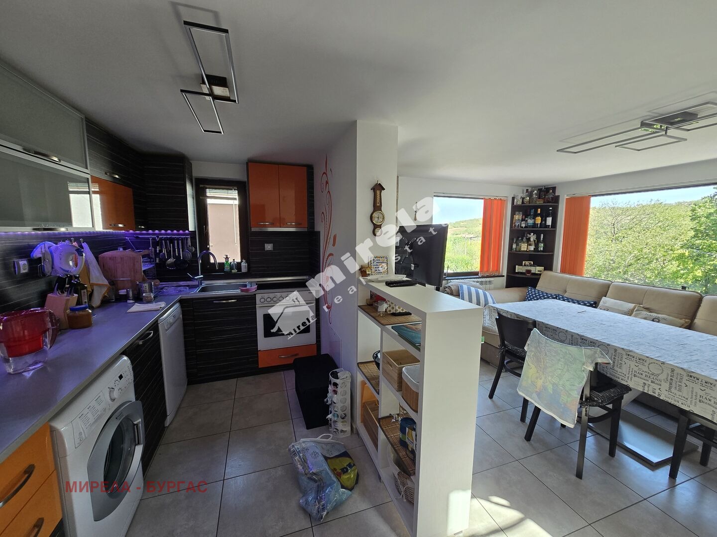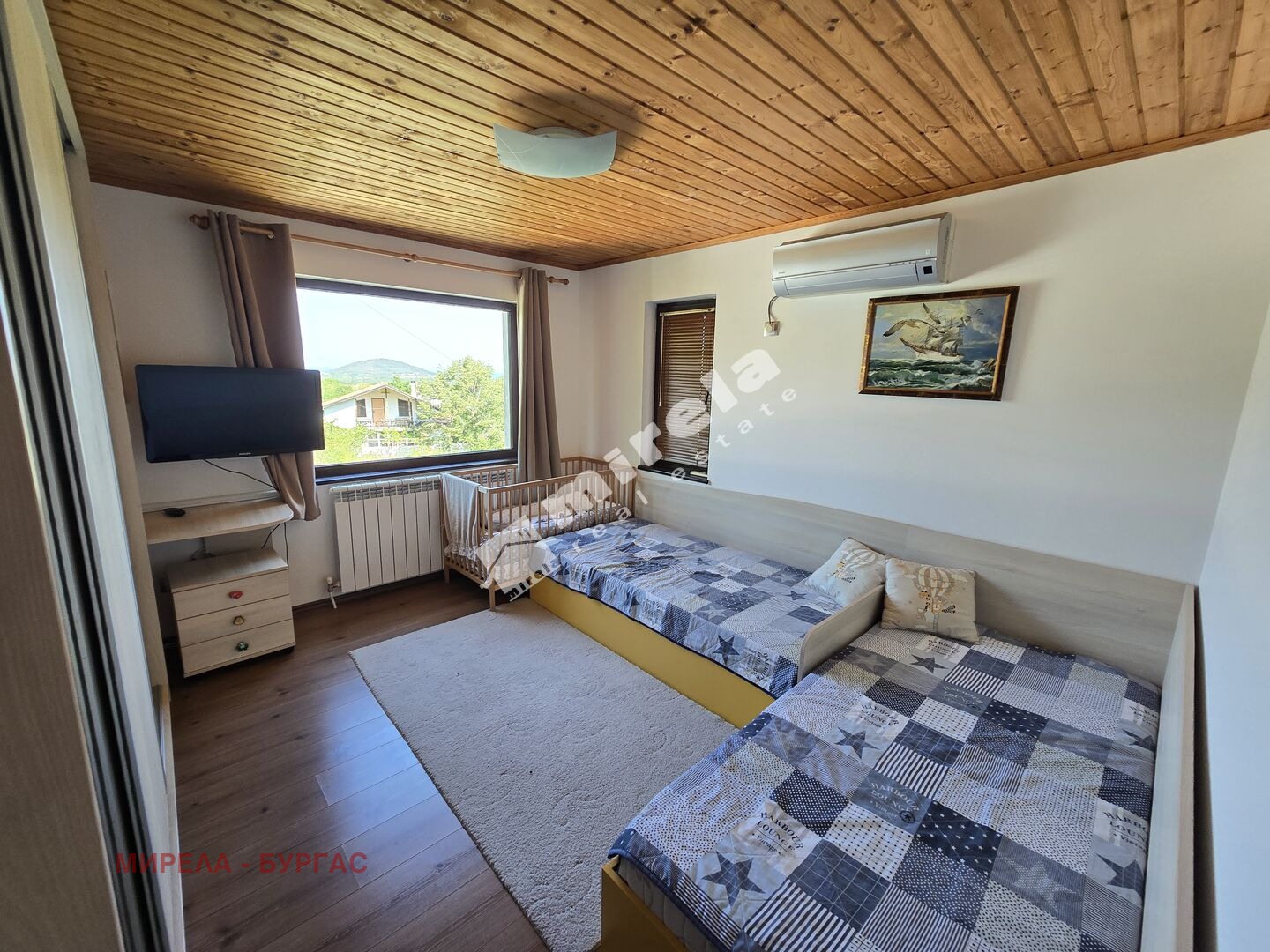 334478 Предлагам за продажба напълно обзаведена къща в село близо до града, само на 15 минути от Бургас, на 10 минути от Созопол и 5 минути от морето. Разположена в живописен район с много зеленина, в близост до гора и с прекрасна панорамна гледка към бургаския залив - нос Атия и залива Вромос. Подходяща за целогодишно обитаване като постоянен дом или за вила. Имотът се състои от къща с РЗП 100кв.м. и находяща се непосредствено до нея допълнителна масивна постройка/трапезария с РЗП 15кв.м. Облагороден двор от 600кв.м с възможност за увеличаване с допълнителни 500кв.м. срещу символична сума. Разполага с централно водоснабдяване и електричество. В допълнение за напоителни нужди е осигурена вода от подземен водоизточник с неограничен дебит. Разпределение: Първи етаж състоящ се от просторна всекидневна с обособен кухненски бокс и санитарен възел - баня с тоалетна. Мазе с приблизителна квадратура 16кв.м. Дизайнерска вита стълба от масивно желязо водеща към втори етаж, състоящ се от: коридор с излаз към голям балкон с изглед към морето, две спални, много голяма баня с тоалетна и вана.