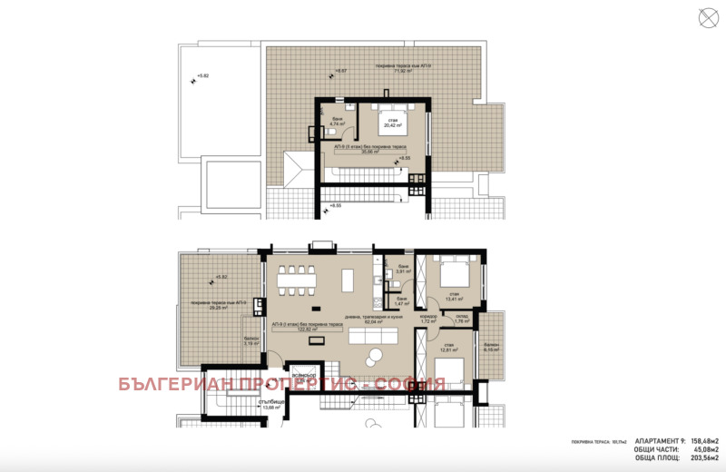 Мезонет 9 , обща площ 311.31 кв.м. (нетна площ 158.48 кв.м. + общи части 45.08 кв.м.), плюс терасата от 100.20 кв.м. - , плюс мазе от 7.55 кв.м. - .