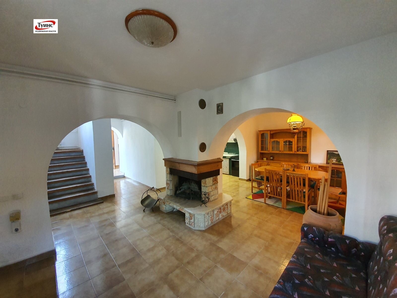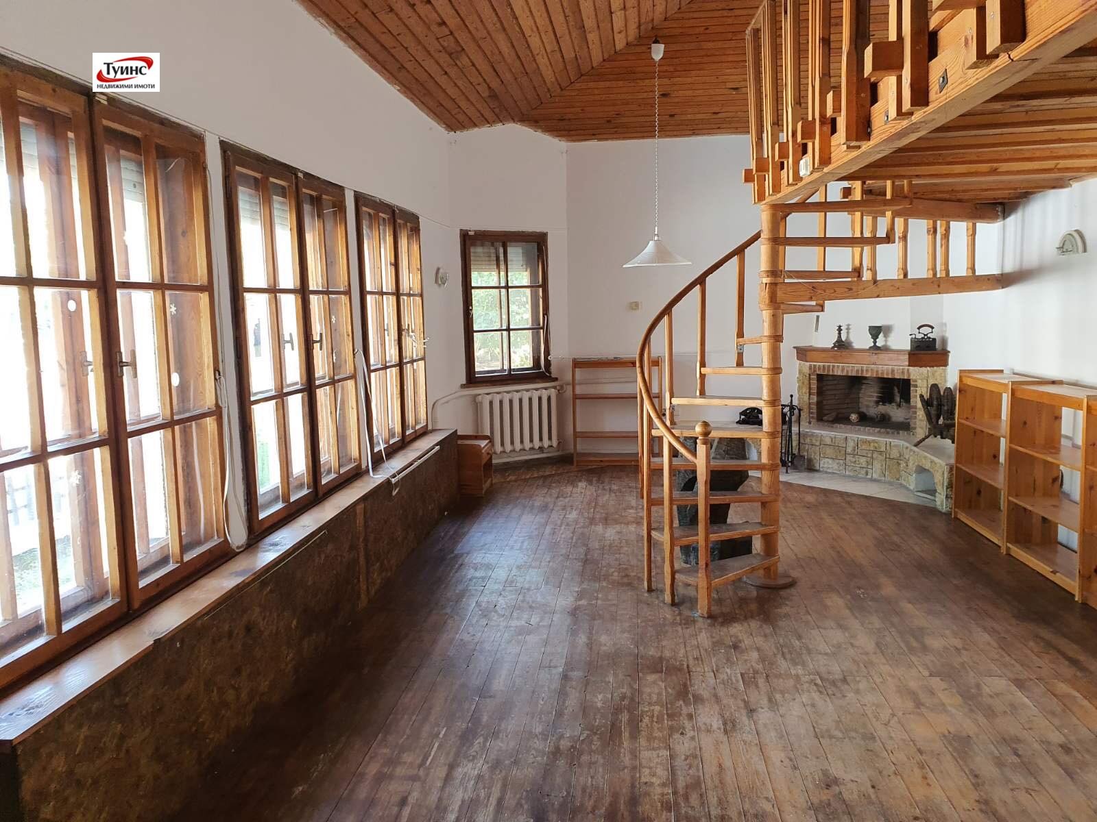 Разпределение на етажите - ПАРТЕР - входно антре, баня и тоалетна, просторна всекидневна с камина, на полуниво - спалня, отделна кухня с трапезария, камина.