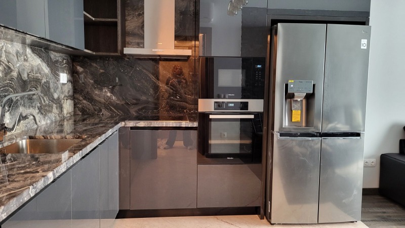 Чисто нов луксозен дизайнерски апартамент под наем в нова сграда в близост до пешеходната част на бул. Витоша. Кухня с всекидневна - Висок клас вградени уреди Miele - пералня, миална, котлони, аспиратор, фурна, микровълнова, хладилник SAMSUNG с 2 врати с ледогенератор, мраморен плот. 2 дивана с кожена тапицерия, климатик, маса за хранене, италиански паркет дъб, балкон. 2 Спални, всяка една с двойно легло с повдигащ механизъм, гардероб, нощни шкафчета, климатик, италиански паркет дъб, балкон. Баня с тоалетна с душ-кабина и мивка, санитария Roca, италиански аксесоари и естествен камък - мрамор, душ. Втора тоалетна. Сервизно помещение - проточен бойлер. Австрийски осветителни тела в стаите, коридора и банята. Коридор - шкаф за дрехи и обувки. Достъп във входа - с чип и видеонаблюдение.