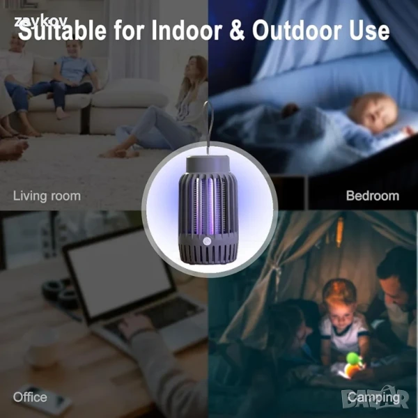 Мощен и издръжлив репелент против комари: уредът против комари използва мощна UV светлина с дължина на вълната 395 nm, за да привлича комари и да ги убива чрез токов удар от вътрешното високоволтово захранване. Изработен от висококачествен ABS материал, устойчив на топлина, износване и надраскване, удължава експлоатационния живот.