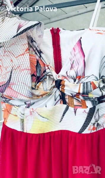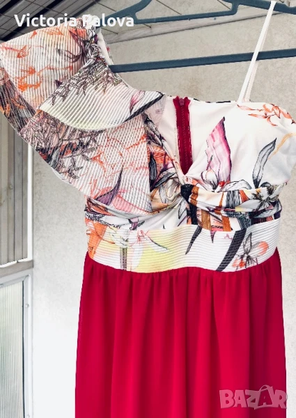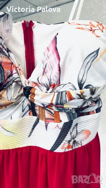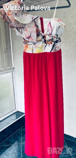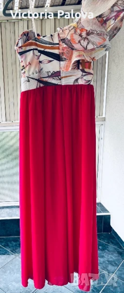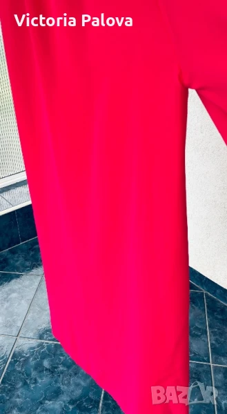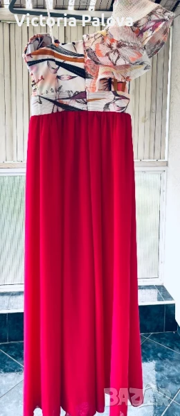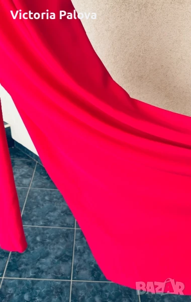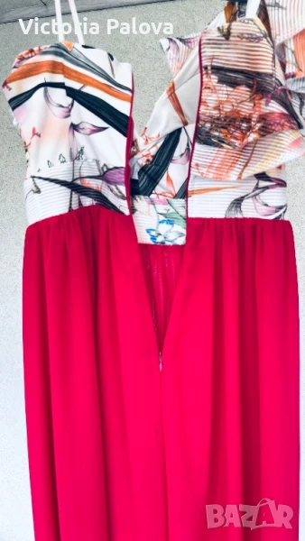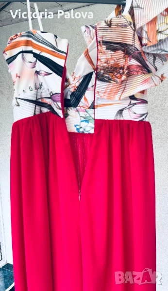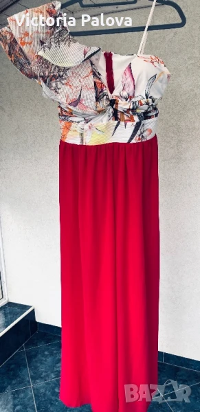 Гащеризонът е обличан само веднъж, много красив, ефектен и впечатляващ. Цялата му дължина е 135см, крачолът горе широк 49см, надолу се разширява, в долния му край е 60см, материята е приятна , тежка , не прозира, защото е двойна. Горната част на гащеризона е с гръдна обиколка 40см, материята е разтеглива, чашките на бюста са твърди, държат форма, на гърба е с цип. Ивицата под бюста не се разтяга , широка е 38см едностранно, височината ѝ е 6см.