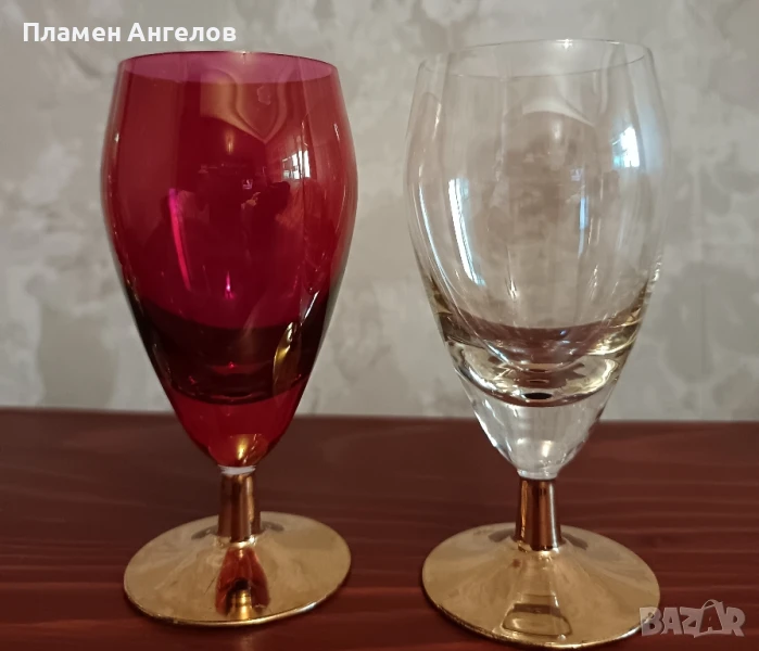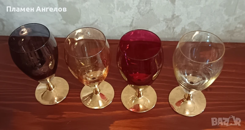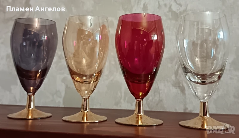 Ретро комплект от 4 красиви, цветни чаши със златна основа, столчета. Винтидж от 70години. Неизползвани в отлично състояние без забележки. Размери :високи 12 см., горен диаметър - на отвора 5.2см.,диаметър на столчето4.8см 5.2 см. Вместимост 100гр.,без да се препълва нормално.