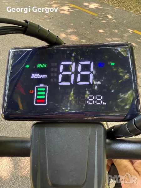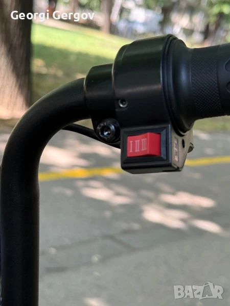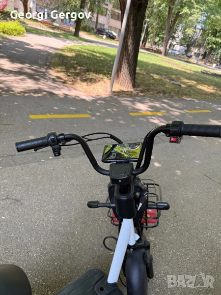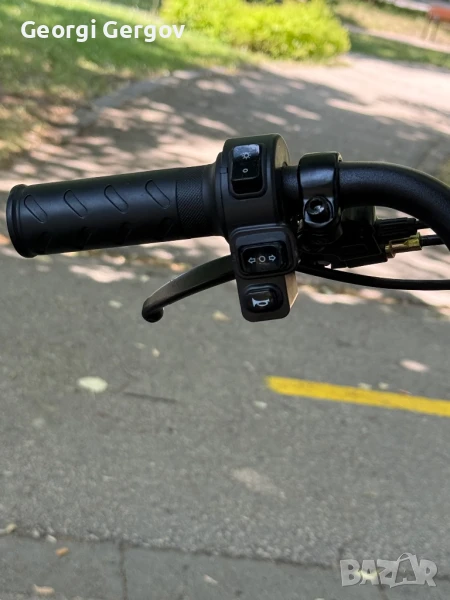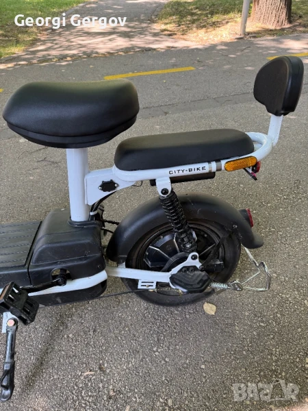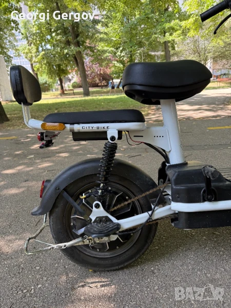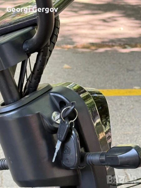 Закупен е м. януари, вдига около 30 - 40 км/ч., товароносимост - до 150 кг.Има фар, стоп, мигачи, гуми - 14 цола. Задното колело може да се заключва с аларма и отделно с ключ. 350W, 42V.