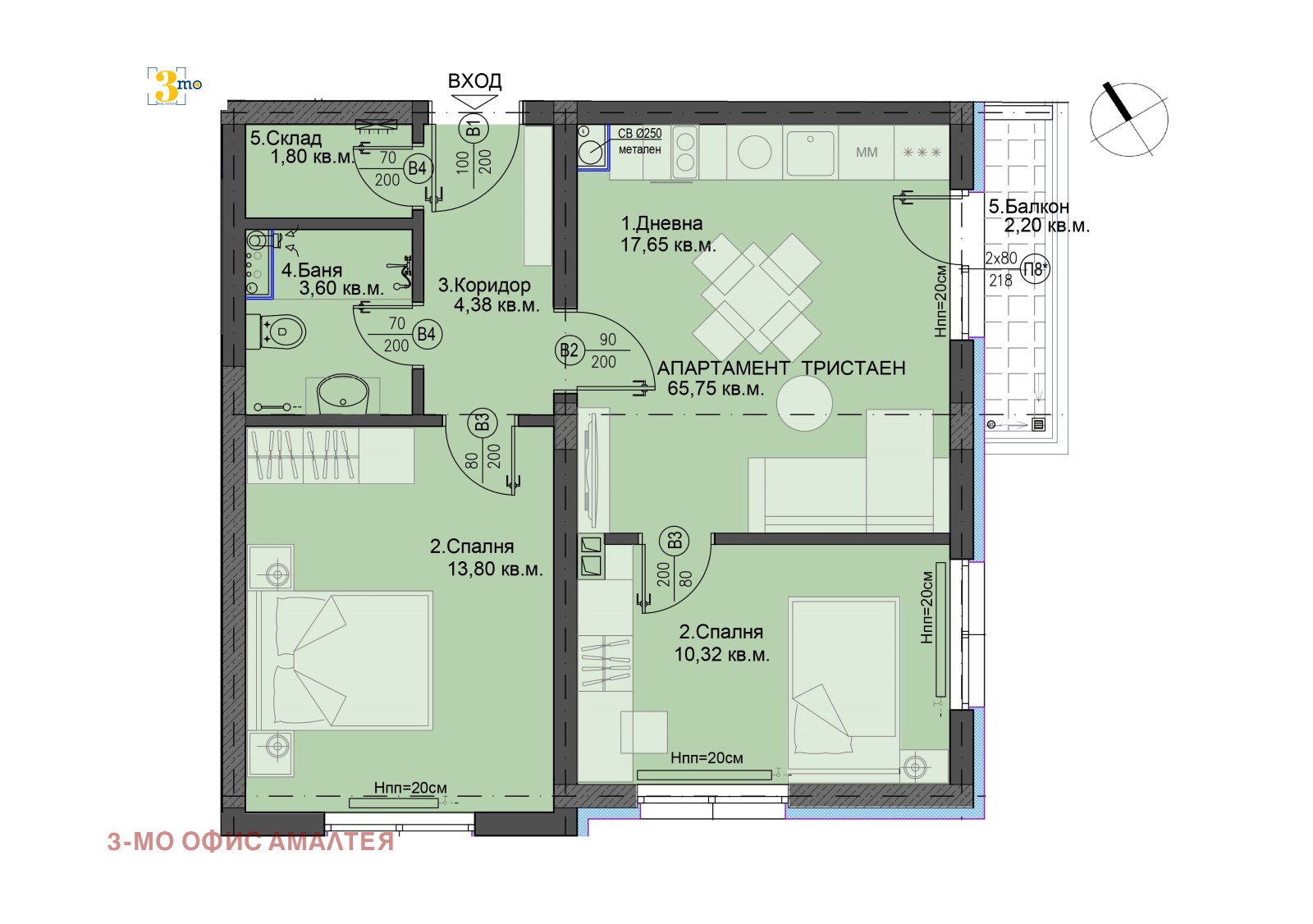 3mo Амалтея има удоволствието да Ви предложи двустаен апартамент изключително лесен за преустройство в тристаен. Разположен е в нова модерна жилищна сграда пред Акт 15 в ж.к. Люлин 5. Предложеният имот е с обща площ от 76 кв.м. (застроена 66 кв.м.) и е подходящ, както за живеене, така и за инвестиция. Имотът се състои от: входно антре (4,38 кв.м.), всекидневна с кухненски бокс и трапезария (8,15 кв.м.) с балкон (2,40 кв.м.), спалня (13,80 кв.м.), складово помещение (1,80 кв.м.) и санитарно помещение (3,60 кв.м). Разположен е на осми жилищен етаж от общо десет етажа с изложение юг и югоизток. Продава се в степен на завършеност по БДС и опция за индивидуална оферта от инвеститора за довършителни работи и обзавеждане. Отделно може да се закупи паркомясто или гараж. Планирано е разрешение за ползване в началото на 2026-та година.