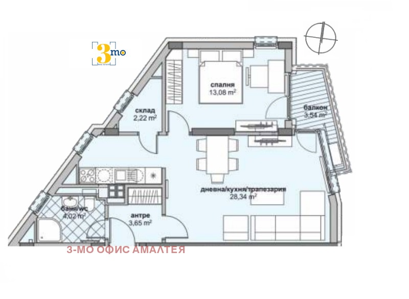 3mo Амалтея има удоволствието да Ви предложи двустаен апартамент в нова жилищна сграда в ж.к. Люлин 6. Предложеният имот е с обща площ от 81,39 кв. м. (застроена 69,86 кв. м.) и се състои от: входно антре (3,65 кв. м.), всекидневна с кухненски бокс и трапезария (28,34 кв. м.) с излаз на балкон (3,54 кв. м.), спалня (13,08 кв. м.), складово помещение (2,22 кв. м.) и баня с тоалетна (4.02 кв. м.). Апартаментът е разположен на четвърти от общо девет етажа. Има изложение изток, запад и север. Планирано Разрешение за ползване 2026 година. Имотът е изключително подходящ за инвестиция, с цел отдаване под наем. Към него може да се закупи паркомясто или гараж. Инвеститорът на проекта има дългогодишен опит в строителството на жилищни сгради в град София. В строителството използва материали от висок клас и съвременни технологии на изпълнение.