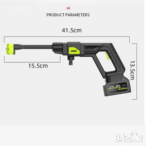 Тази безжична водоструйка за миене под високо налягане е оборудвана с мощен мотор с максимална мощност от 300 W. Максималното достигано налягане е 5 MPa, с дебит 240 л/ч. Работната температура на водата вможе да е от 0°C до 50°C Основният модул тежи 1150гр, което го прави лесен за употреба от жени. Комплекта идва с практично куфарче за съхранение и пренасяне.