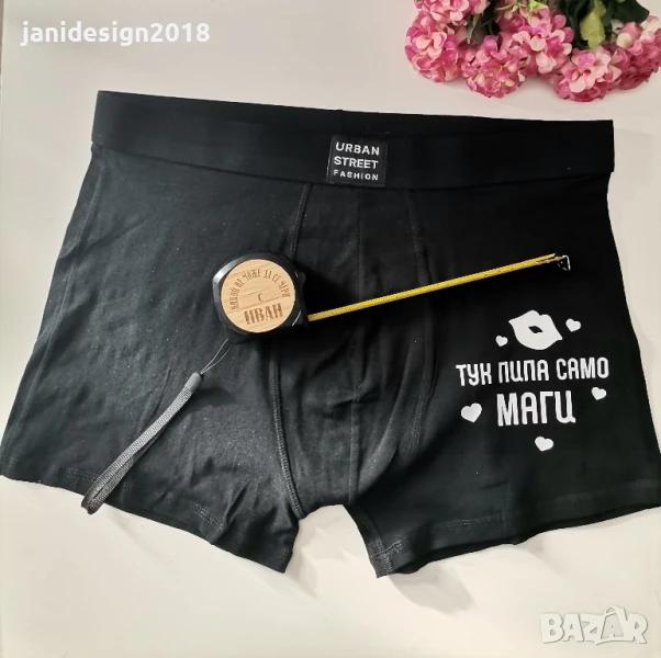 Подаръчен комплект за младоженец на ергенско парти*боксерки с надпис "От утре тук пипа само....." с име по поръчка*Ролетка с гравиран надпис "Никой не може да се мери с...." име по поръчка