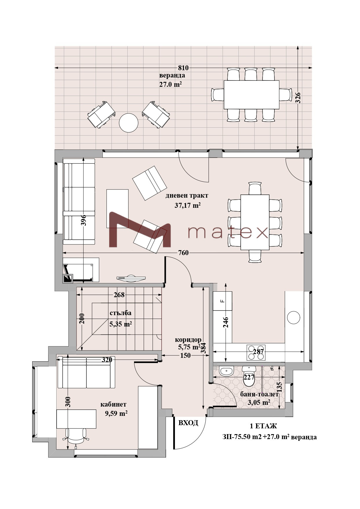 Първи етаж: Светъл дневен тракт с кухня и трапезария, Излаз към голяма веранда