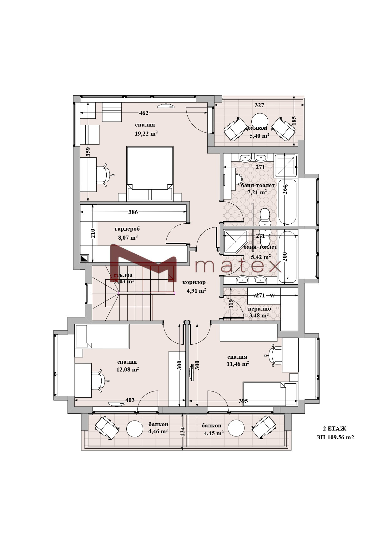 Родителска спалня с дрешник, самостоятелна баня с тоалетна и тераса, две детски стаи с излаз към тераса, Втора баня с тоалетна и Перално помещение