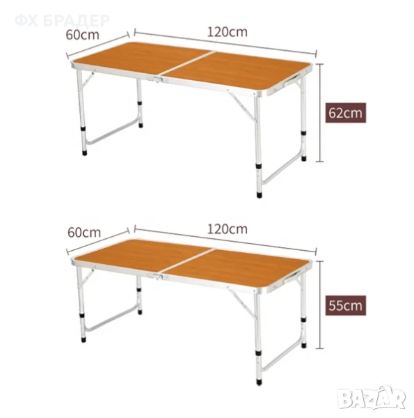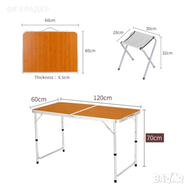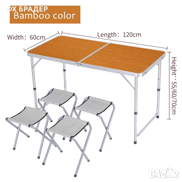 Практичен и лесен за пренасяне, този сгъваем комплект включва маса с четири стола – идеално решение за къмпинг, пикник, градина или риболов. Комплектът е изработен от лек, но здрав алуминий, с регулируема височина на масата (от 55 до 70 см), което осигурява максимален комфорт при всякакви условия.