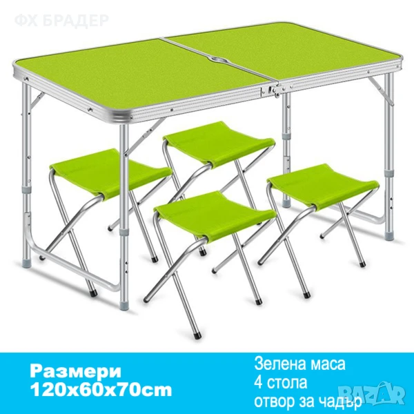 Сгъваем комплект къмпинг маса с 4 стола и отвор за чадър – алуминиев, лек и компактен