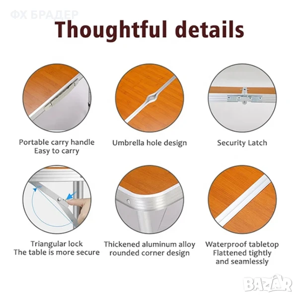 Предлага се в три стилни цвята – сив, зелен и дървесен. Сгъваемият дизайн позволява бързо прибиране и удобно съхранение. С общо тегло от едва 7 кг, комплектът е лесен за носене навсякъде.
