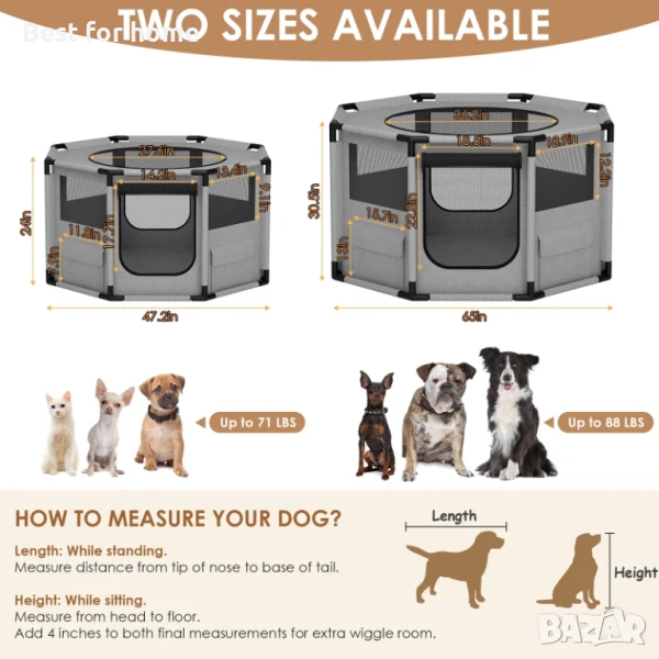 РАЗМЕР: Голям размер - 122x122x61 см. Подходящ за котки, зайци, кученца или малки, средни кучета с тегло до 34 кг, като йоркширски, чихуахуа, френски булдози, померан, пудели и други. Моля, позволете отклонение от 2,5-5 см.