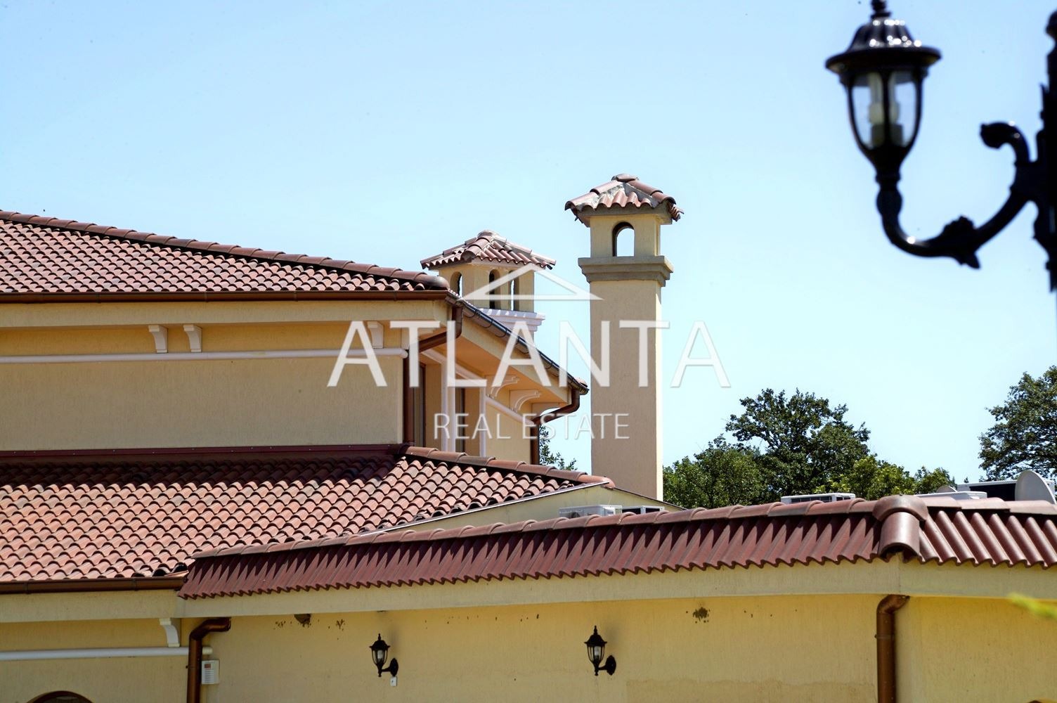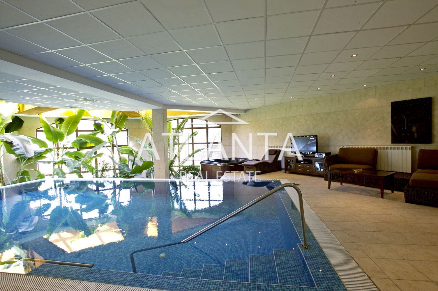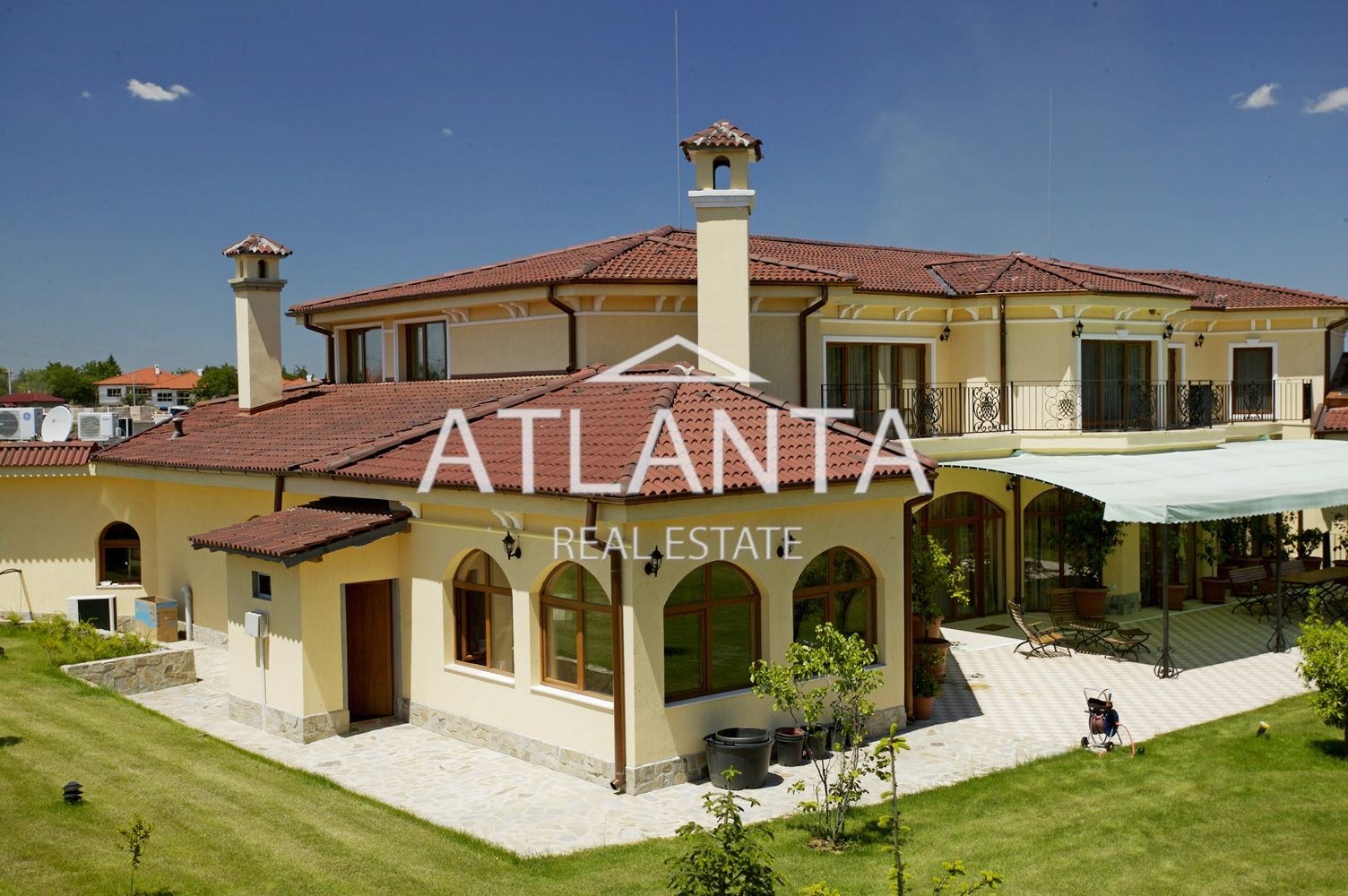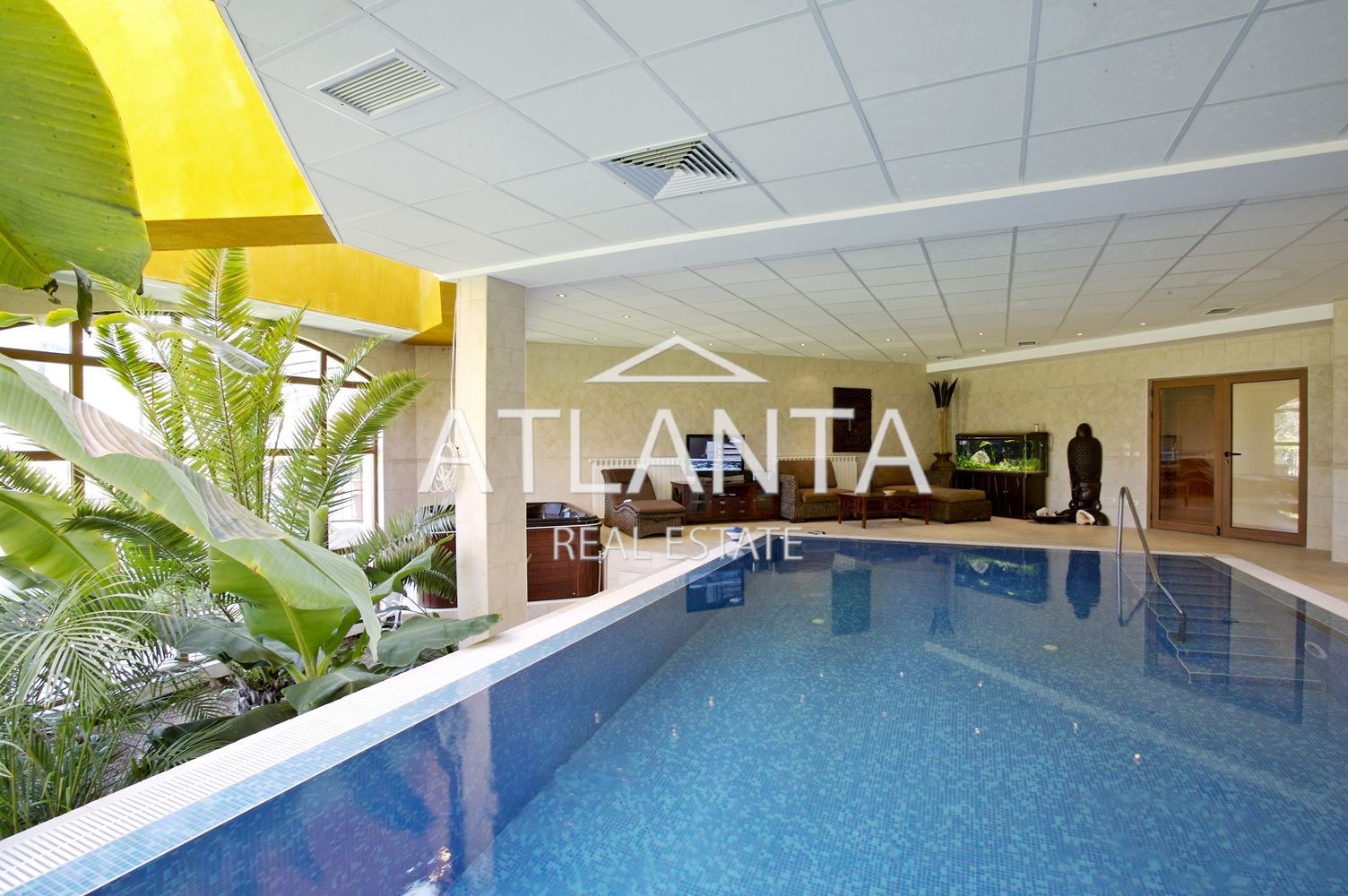 - първи етаж - просторно антре, голям днавен тракт, включващ кухня, трапезария, кът с камина, голяма маса за гости, мека мебел, веранда, 3 спални, всяка със самостоятелна баня с тоалетна, закрит отопляем басейн, зимна градина, закрито барбекю.