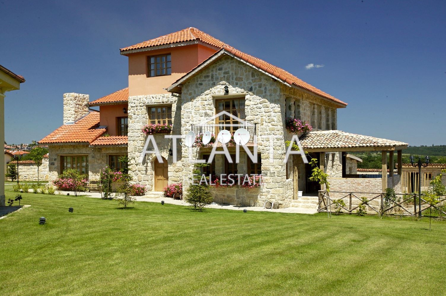 - дневна с кухненска част, 5 спални, всяка с баня с тоалетна, ателие за творческа дейност, навес с беседка.