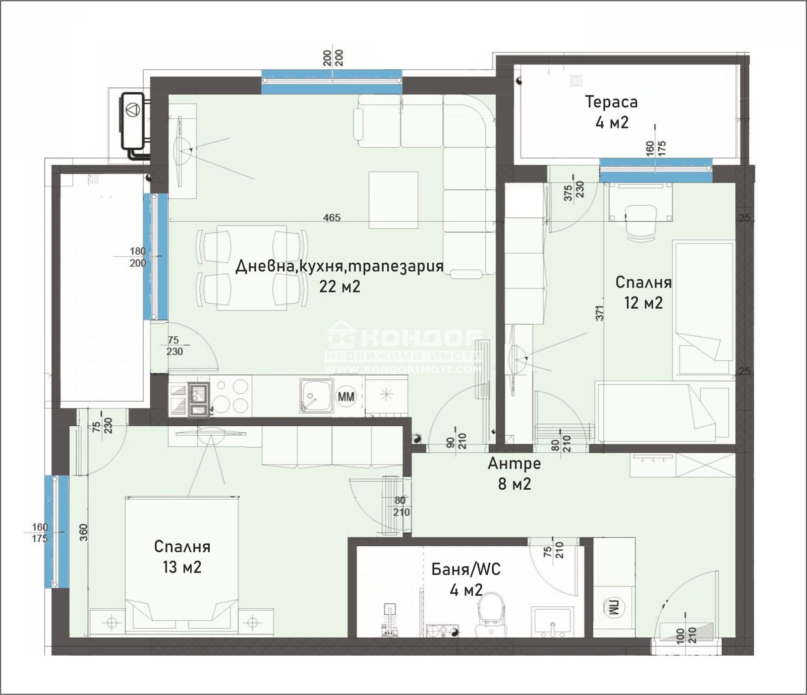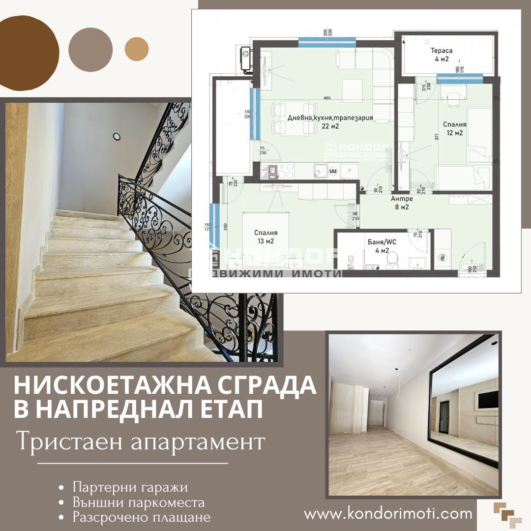 Оферта 63026:АКТ 16 !!!! Бутиков затворен комплекс от затворен тип с модерна и устойчива архитектура, потопена в богато озеленени площи, вдъхващи на живущите комфорт и спокойствие. Комплекса предлага просторна спокойна среда с бърз достъп до центъра на града, както и възлови булеварди. Предлагаме ви тристаен апартамент с ъглова дневна 22 кв.м. с трапезария и кухненска част, две самостоятелни спални: детска 12кв.м. и родителска 13кв.м., баня с тоалетна, широко входно антре с място за гардероб, перално и две тераси. В близост са ситуирани ресторанти, хипермаркети, училища и детски градини. Изградени са луксозни общи части с предоставено облагородено дворно място, пейки за отдих и детски площадки за игра. Апартаментите се издават на: