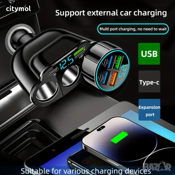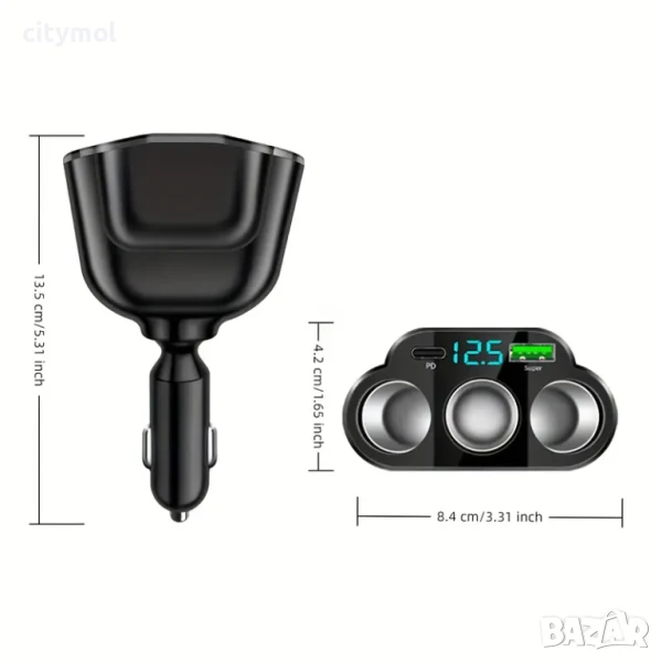 Троен разклонител на запалката + USB изхода(QC 3,0 +2,4 A) + TYPE C за зареждане на Таблети, Навигации, Телефони, Игри и др. Все по-необходим, удобен и търсен продукт с елегантен дизайн и индикатор за захранване. Вграден волтметър за следене на състоянието на акумулатора.