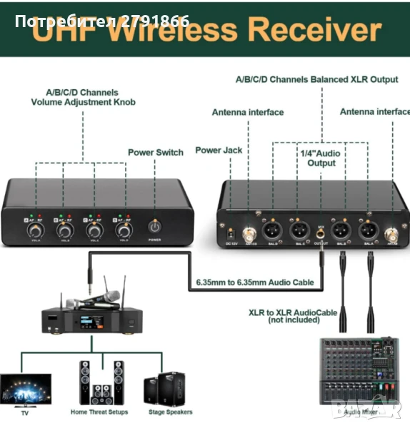 - Този безжичен приемник е с двойна антена, която може стабилно да приема сигнали от 4-канален микрофон и да приема безпрепятствено на разстояние до 50 метра, със силна анти-смущения.