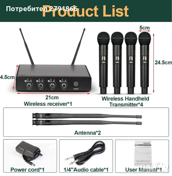 Безжичен приемник*1, 6.35 мм кабел*1, Захранващ адаптер*1, Безжичен ръчен микрофон*4