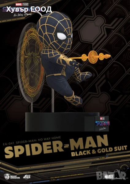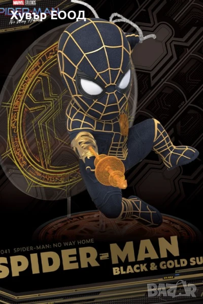 Фигурка от серията статуи Egg Attack: Спайдърмен в бойна поза, облечен в черно-златист костюм от филма „Спайдърмен: No way home“ на Marvel. Основното тяло е високо около 17,5 см и е облечено в платнен костюм. За да се подчертае цялостната текстура и детайлите на облеклото, има работещи LED светлини в емблемата на черната магия на гърдите и на китките, символизиращи тайната магия на Спайдърмен и Доктор Стрейндж. Статуята внимателно възпроизвежда и изобразява екшън момент от сцена от филма.