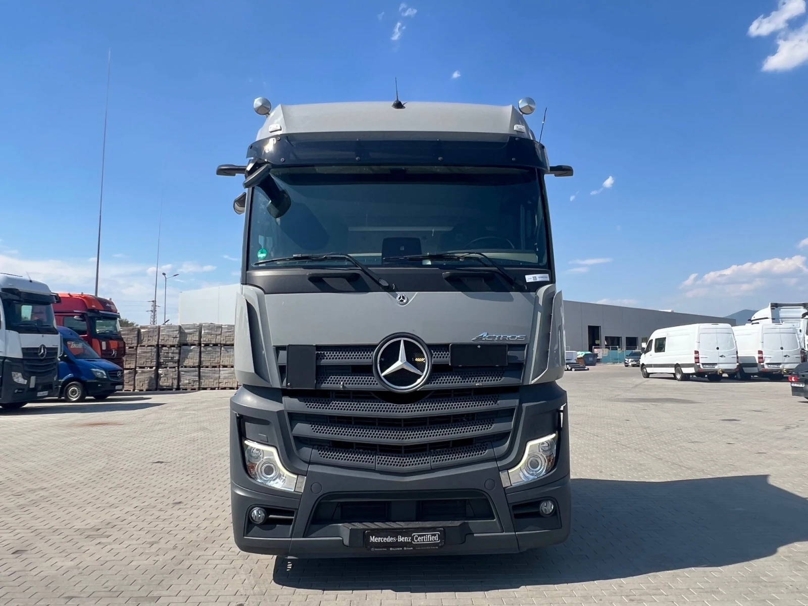 СЕРИЙНО И ДОПЪЛНИТЕЛНО ОБОРУДВАНЕ A1C Преден мост 7, 5 т A1Z Преден мост, офсетна версия A2E Заден мост, коронно колело 440, хипоиден, 13, 0 т A5G Предаващо число на моста I = 2, 412 B1B Електронна спирачна система с ABS и ASR B1F Отопление, електронен блок за обработка на въздуха B2A Дискови спирачки на преден и заден мост B3H Вторичен ретардер воден тип B4A Сензор за кондензация, за система със сгъстен въздух B4M Въздушен резервоар, стоманен B5J Спирачни и електрически връзки, ниски C0A Надвес на рамата 750 мм C1W Междуосие 3700 мм C5B Стъпало над рамата, частично покритие C5D Стъпало, зад кабината, ляво C6I Помпа на сервоусилвателя на волана, контролирана C6Q Стабилизатор, преден мост C7F Преден подпорен мост предпазител (ECE), алуминий C8C Задно крило, ширина на превозното средство 2500 мм C8Y Аеродинамични облицовки на долната част на каросерията C8Z Странични прагове, аеродинамични D0A Кожен волан D0L Пакет за пушачи D0S Връзка за сгъстен въздух, в кабината D1C Комфортна седалка на водача с окачване D1N Сгъваема седалка на спътника D2N Облегалка на шофьорската седалка, механизъм за освобождаване D2W Подлакътници от двете страни, седалка на водача D3A Луксозно легло, горно, широко, с контрол на нивото D3B Луксозно легло, долно D3M Матрак, PremiumComfort, долен D4S Сенник, електрически, еднокомпонентен D4T Завеса, отстрани на леглото(ата) D4Z Сенник, страничен, от страната на водача и водача D5Y Гумени стелки, от страната на водача и водача D6C Допълнителен климатик, електрически D6G Автоматичен климатик D6I Използване на остатъчната топлина от двигателя D7G Капак на отделението за вещи, от страната на водача и водача D7J Чекмеджета, под легло D7K Чекмеджето, под опората на таблото D7R Клапи за багаж, над предното стъкло D8M Плъзгащ се/накланящ се люк, електрически, стъклена версия E1T LIN генератор E3B Точка за свързване 12V/15A, за спомагателни консуматори E3E Допълнителен контакт, 12 V/15 A, пространство за краката на спътника E3R Захранващ контакт, 24 V/25 A, пространство за краката на спътника E3S Контакт 24 V/15 A, в страничното пространство за съхранение, дясно E4B Интерфейс, система за управление на автопарка FMS E6A Контакт за ремарке, 24 V, 15-пинов E6Y Предупреждение за заден ход, комбинирано с аварийни светлини E7F Кабелно дистанционно управление за пневматично окачване E9G Подготовка за монтаж на електрически устройства E9I Предварителна инсталация, превключвател, повдигаща се ос, полуприцеп/ремарке F0T Звезда на Mercedes, осветена отзад F1H L-кабина BigSpace, 2. 50 м, равен под F1R L-кабина F2A Вариант на пода, равен под F2H Ширина на кабината 2. 50 м F2P Кабина, височина на закрепване 765 мм F2V BigSpace F3C Крепежи на кабината, комфорт, с въздушно окачване F3W Механизъм за накланяне на кабината, механично-хидравличен F4H Задна стена на кабината, без прозорец F4X Външен капак на отделението за вещи, ляв F4Y Външен капак на отделението за вещи, десен F4Z Шкафче за вещи, ляво, под кабината F5B Въздушен дефлектор, щракващ се, със странични дефлектори на кабината F5L Сенник, външен, прозрачен F5Y Облицовка на A-колона F6C Предно стъкло, тонирано F6I Предно огледало, отопляемо F6R Клаксони, покрив на кабината F7A Броня, с пластмасови ъгли F7C Централна част на бронята с теглич F7T Удължение на вратата F7X Вход за кабината, ляв/десен, твърд F8B 2 ключа за дистанционно управление F8E Заключваща система с централно заключване F8F Разширено централно заключване G2E Трансмисия G 281-12/14. 93-1. 0 G5A Еднодисков съединител G5G Mercedes Powe