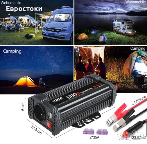 600 W инвертор за кола. NDDI инверторът с 230 V AC контакт, 2 USB порта (3,1 A) и 1 щепсел за запалка осигурява стабилно захранване за лаптопи, игрови конзоли, телевизори, iPad, смартфони и други електронни устройства.