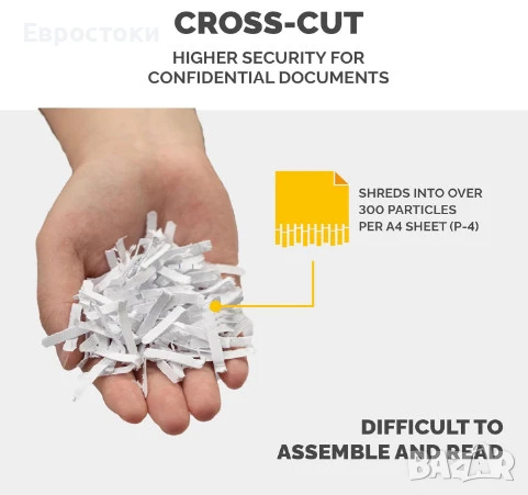 • Унищожава хартия, телчета, кламери, пластмасови карти
