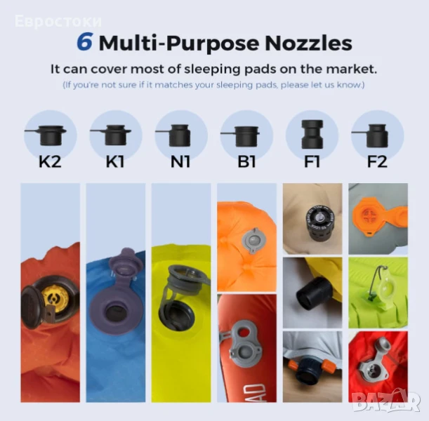 Универсална съвместимост. Мини електрическата въздушна помпа е проектирана да работи безпроблемно с различни видове надуваеми продукти. Оборудвана с 6 различни дюзи, тя е съвместима с KLYMIT, NEMO, BIG AGNES, WINLOCK, STS, EXPED и др.