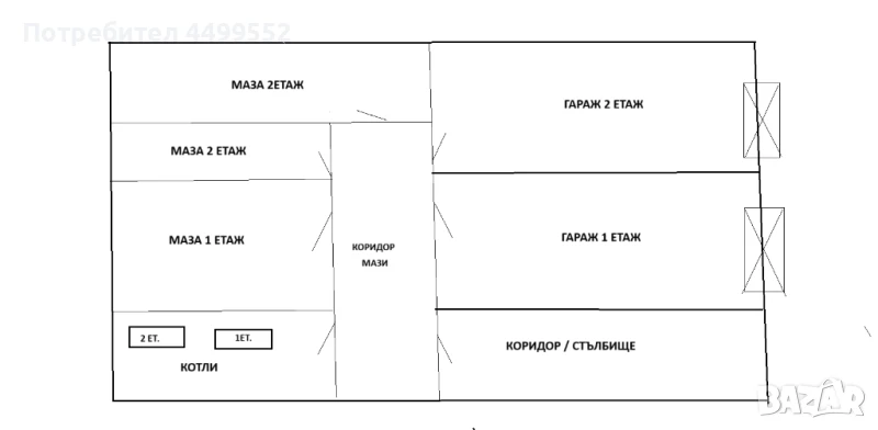 Продавам етаж от двуетвжна къща -1етаж -124кв/м. Гараж 6 х 3,2м. / Н –220см. и маза 4х4м. Всички жилищни помещения имат радиатори за парно отопление като и гаражът истълбището. Само мазата няма радиатор. Парният котел на парната инцталация