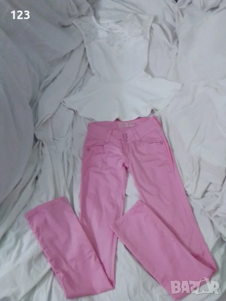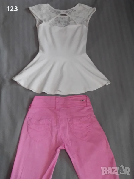 Спортно-елегантен комплект от дантелена блузка и панталон цвят „Пинко-розовата пантера“.