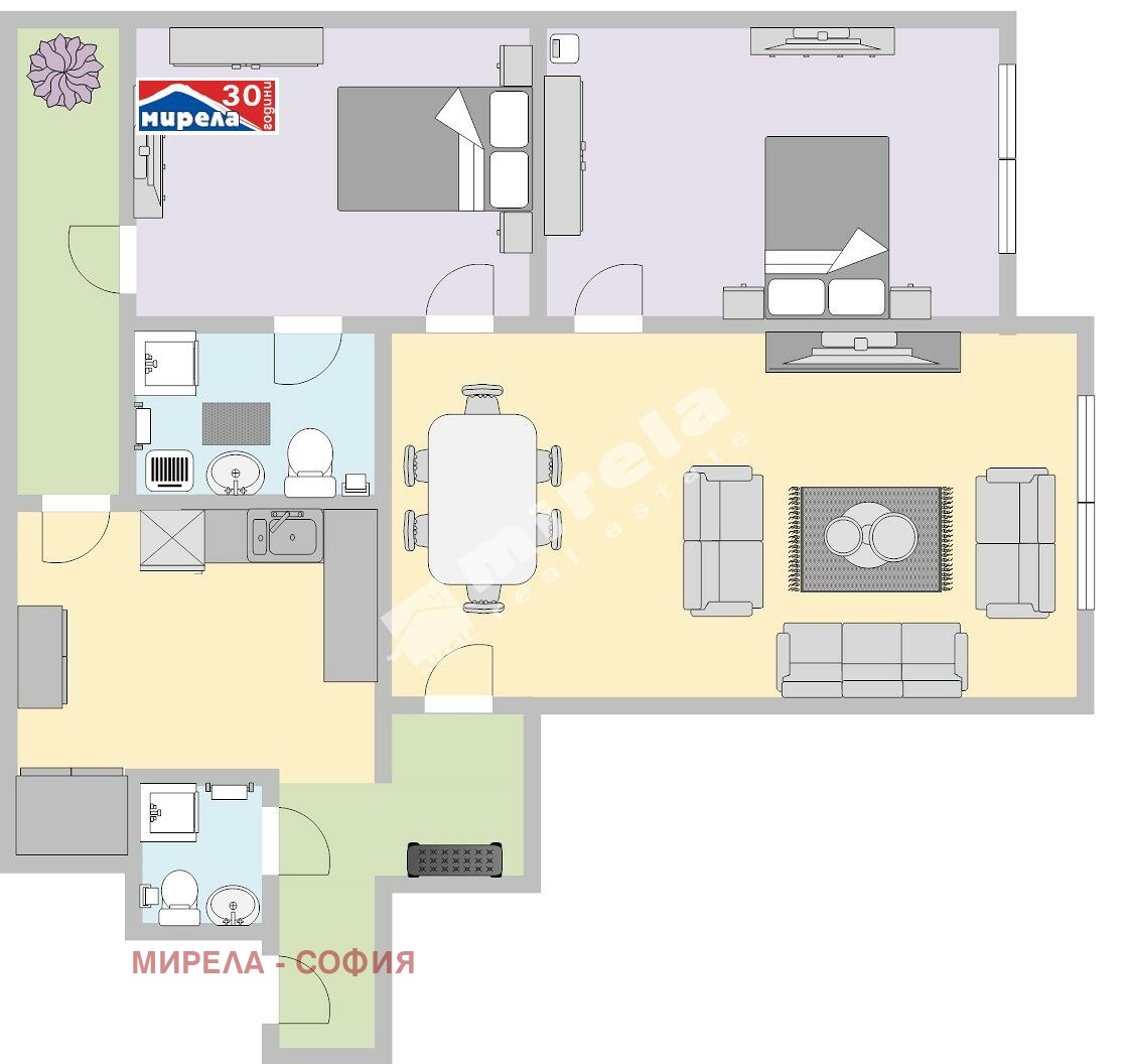 Разпределението включва обширен хол с вестибюл /30.40 кв. м/, с преход към две спални /16 кв. м и 17.50 кв.м/, отделна кухня /10 кв. м/, баня, отделна тоалетна и балкон, извън застроената площ на имота от 80 кв.м.