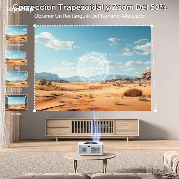 【Автоматична корекция и мащабиране 100%-50%】Домашният проектор HORLAT поддържа 4D±50° цифрова корекция и автоматично мащабиране, което ви позволява да регулирате четирите ъгъла на екрана независимо. Независимо дали го поставите на стената, тавана или под какъвто и да е ъгъл, картината винаги ще бъде перфектна, без изкривяване. Освен това, с функцията за мащабиране, можете да регулирате размера на екрана от 100% до 50%, без да е необходимо да местите проектора.