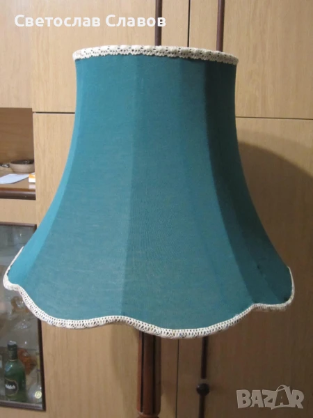 Висок лампион със стойка от стругован и фрезован орех. Лампионът е висок 170 см. Шапката е зелена, висока е 40 см. с конусна форма. С горен диаметър 28 см. и долен 50 см. По кантовете на шапката има украсителни ширити в бежов цвят. Могат да се правят всякакви комбинации между стойките на лампионите и шапките за тях като това няма да промени обявената им цена ! Възможност за договаряне на цената !