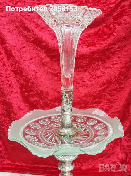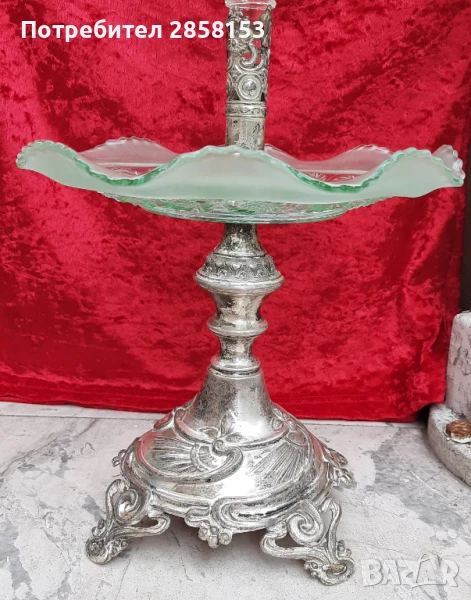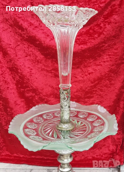 Изработена е от посребрен бронз с две формовани стъкла. Височина 46 см.
