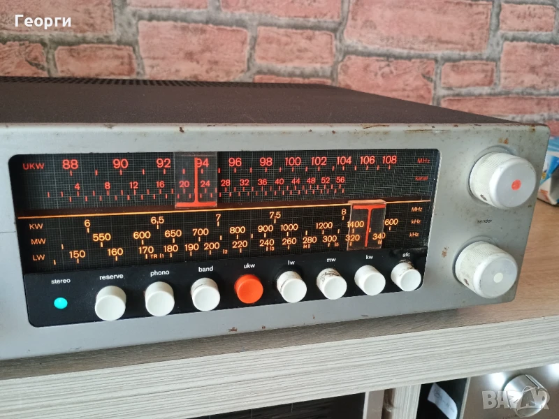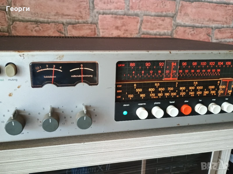 ресийвър, солидно изработен 17кг, изцяло метален. Закупен от Швейцария в този занемарен външен вид. Работи, но има нужда от реставриране, профилактика на бутоните и почистване. Липсва едно декоративно копче вляво (вътре копчето си работи), както и е доста прашасал и замърсен външно. Има много дълбоки корекции и страхотна динамика. В един руски форум дискутират захранването му и казват, че само трансформаторът тежи 8.4кг, което вероятно е поне 500-600вата захранване. Тоест доста здрава изработка. Цялата задна част е огромен радиатор с метални американски транзистори RCA.