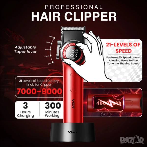 Вид ножчета: Керамични и DLC покритие;Настройки на скоростта: 21 нива;Аксесоари: 14 направляващи гребена, почистваща четка, масло, USB кабел Type-C, зарядна станция;Зареждане: Чрез USB и докинг станция;Цвят: Червен и златен;Предназначение: Подстригване на коса, оформяне на брада, контури и фини детайли.