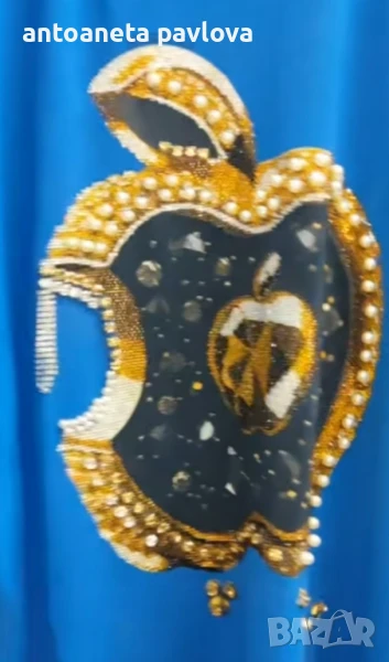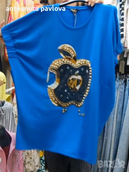 Макси туника в турско синьо с апликация ябълка,перли и камъчета.Свободна кройка .В задната част също има емблема на ябълка .Дължина 81см . Гр.об.175см .