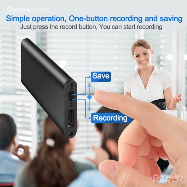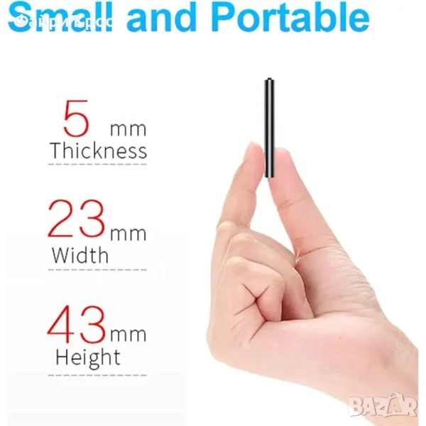 Мини аудио рекордер подходящ за дискретен запис на звук. Отличава се с ултра малките си размери, в които са предвидени висок клас микрофон и голяма батерия.