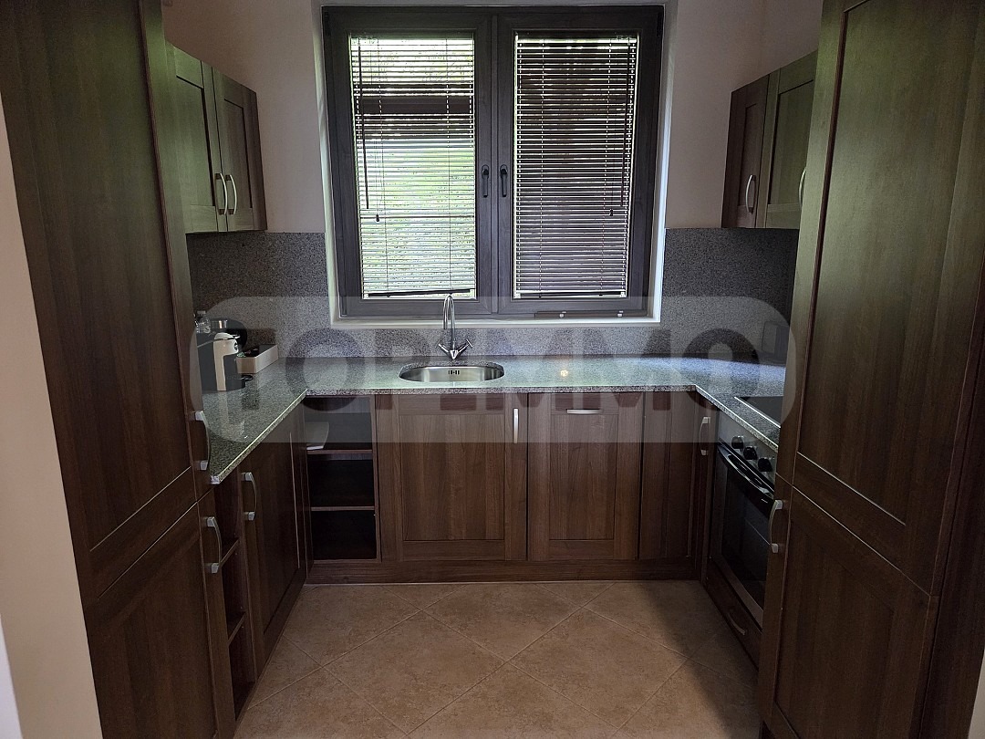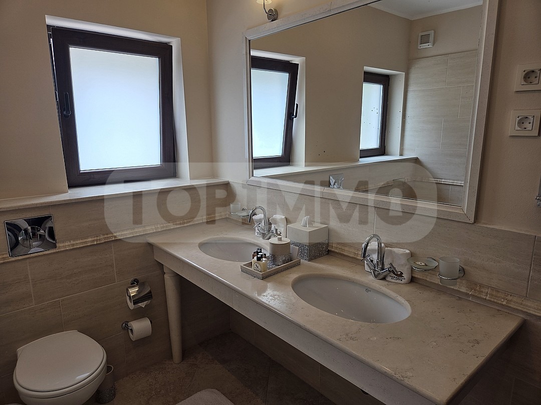 На 182 кв.м. са разположени голяма просторна дневна с кухненска част, 2 спални с баня с тоалетна към тях, едната спалня е с веранда, отделно тоалетна за гости и склад. Разполага с голяма тераса с частична гледка към морето и към голф игрището. Предлага се за продажба напълно обзаведен и оборудван.